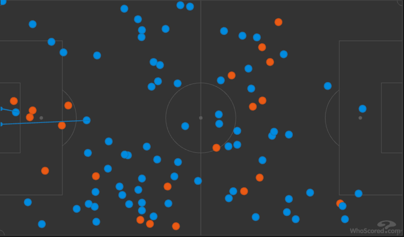 I think the biggest improvement in this game from road games a year ago was the way the Sounders reacted to adversity. But related to that was how they reacted to their opportunity to put the game away. When Ben Sweat was sent off, the Sounders were already leading 2-1. But they wasted almost no time in putting Sporting KC to the sword. Almost immediately after the ejection, the Sounders went through a nearly four-minute spell where they completed 55 passes to KC’s 1. That spell ended when Nicolás Lodeiro found Morris for his third goal. Here’s what that dominance looked like on WhoScored’s action map (Sounders are blue):