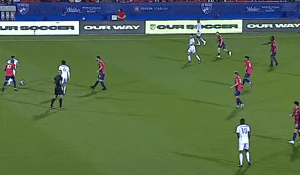 As we have already seen, LA’s shape tends to get a bit narrow when they settle into the attack. Despite being ineffective in wide areas, LA still bring their fullbacks high up the field into their opponent’s half. In this sequence, FC Dallas steal the ball off Riqui Puig in the middle while fullback Kelvin Leerdam is pushing up field: