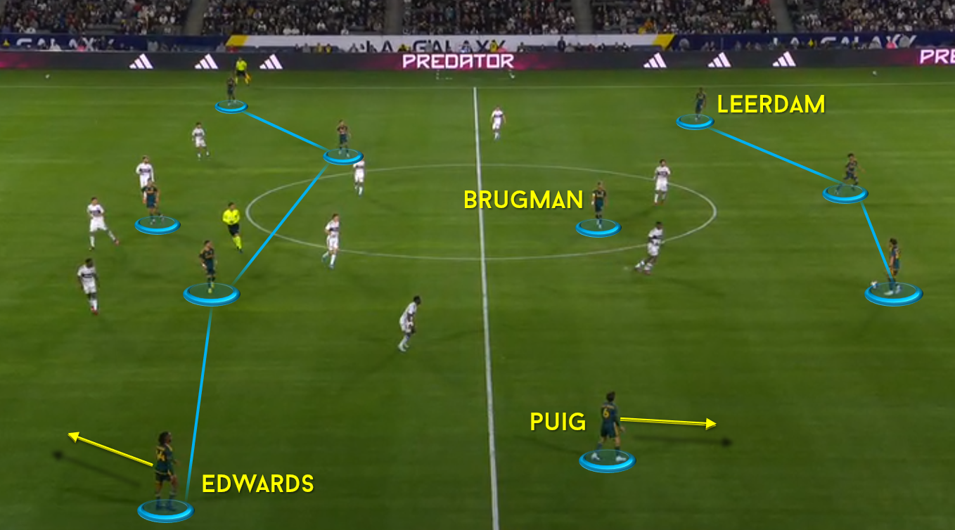 LA’s initial shape in possession is not too dissimilar to Seattle’s. Right back and former Sounder Kelvin Leerdam stays home to form a back three behind midfielder Gastón Brugman, while left back Raheem Edwards takes a position wide of the midfield, supported by attacker Riqui Puig dropping deep on the wing: