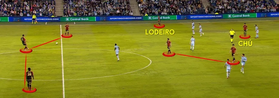 Nicolás Lodeiro was the “false wingback” behind Léo Chú on the left touch line. Nico was almost exclusively left-sided with his touches in this game in order to overload the left with Chú and Jordan Morris. That combination continued to befuddle KC right back Graham Zusi as Seattle’s possession flowed down their left side.