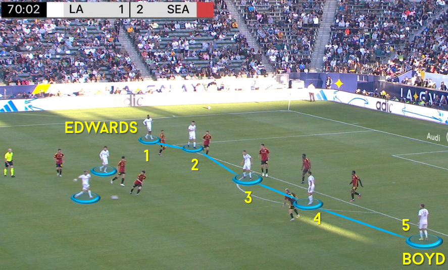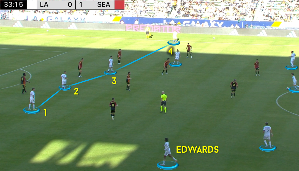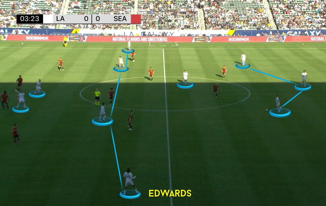At halftime, the Galaxy replaced winger Memo Rodríguez with forward Preston Judd. While much was made on the broadcast of LA adding a second forward and playing with a back three, remember that the LA Galaxy usually start their attacks with a back three anyway. The first half against Seattle was no different, with fullback Raheem Edwards pushing up into midfield when in possession: