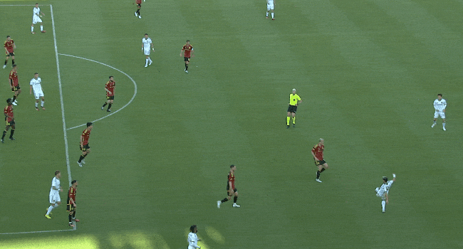 Replacing a more defensive winger in Rodríguez with Judd was one piece of that strategy. The second part was to dedicate wingbacks Edwards and Tyler Boyd to the attack sooner, positioning them higher up the field and wider, thereby stretching Seattle’s back line and opening more space for Puig in the middle. The more aggressive positioning of Edwards was very noticeable between halves. Here is LA in the first half: