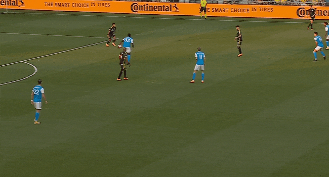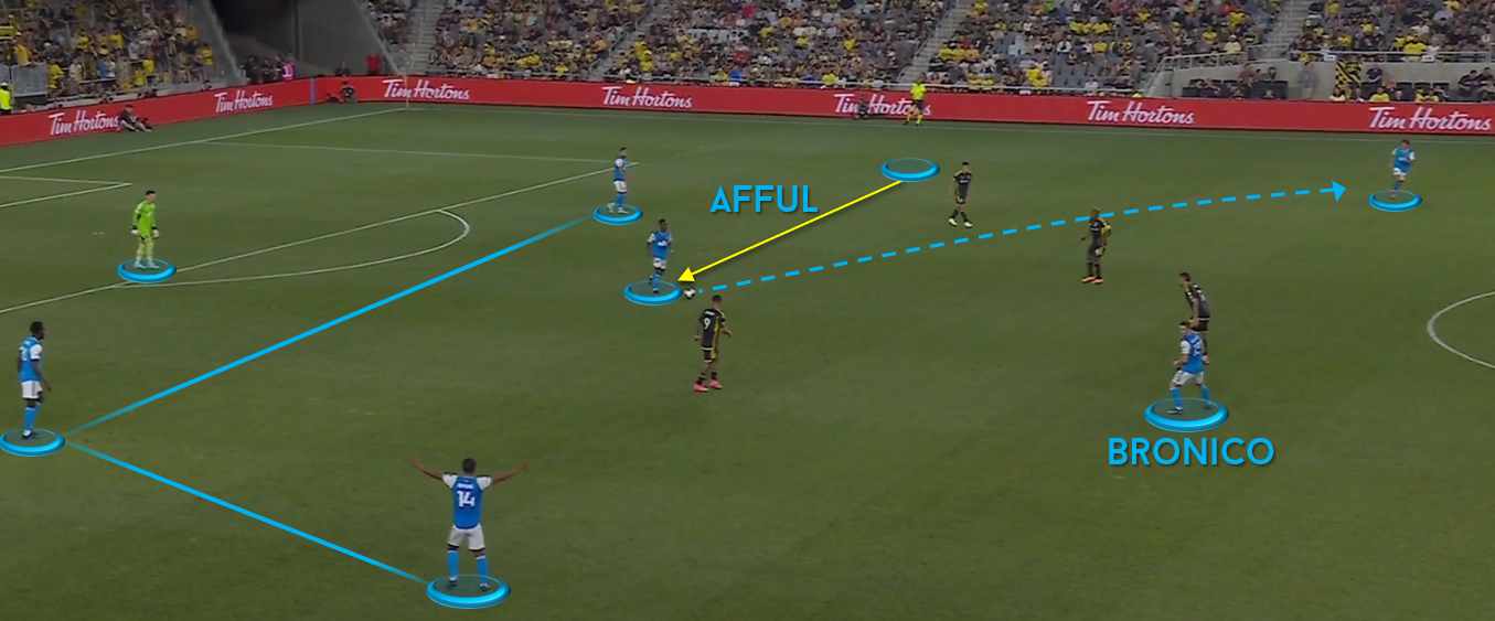 Charlotte’s build-up is another example of a back four resembling a back three in practice. Rather than sending one fullback high, as the Sounders do, Charlotte often send left back Harris Afful inside, ahead of the centerbacks to act as a second pivot with Brandt Bronico while opening up passing lanes to the left wing: