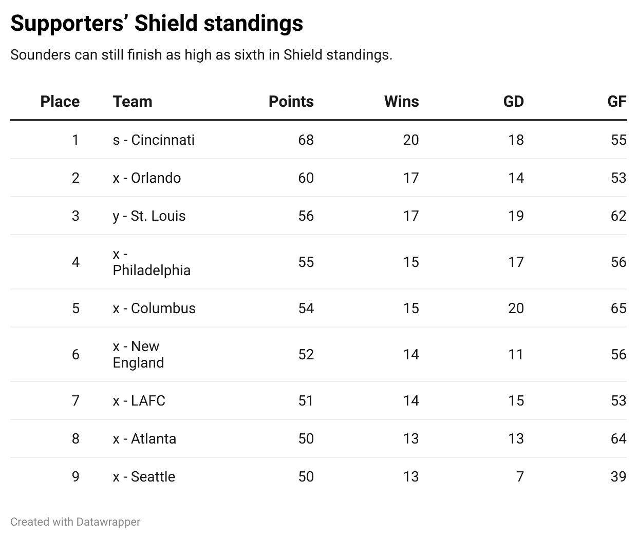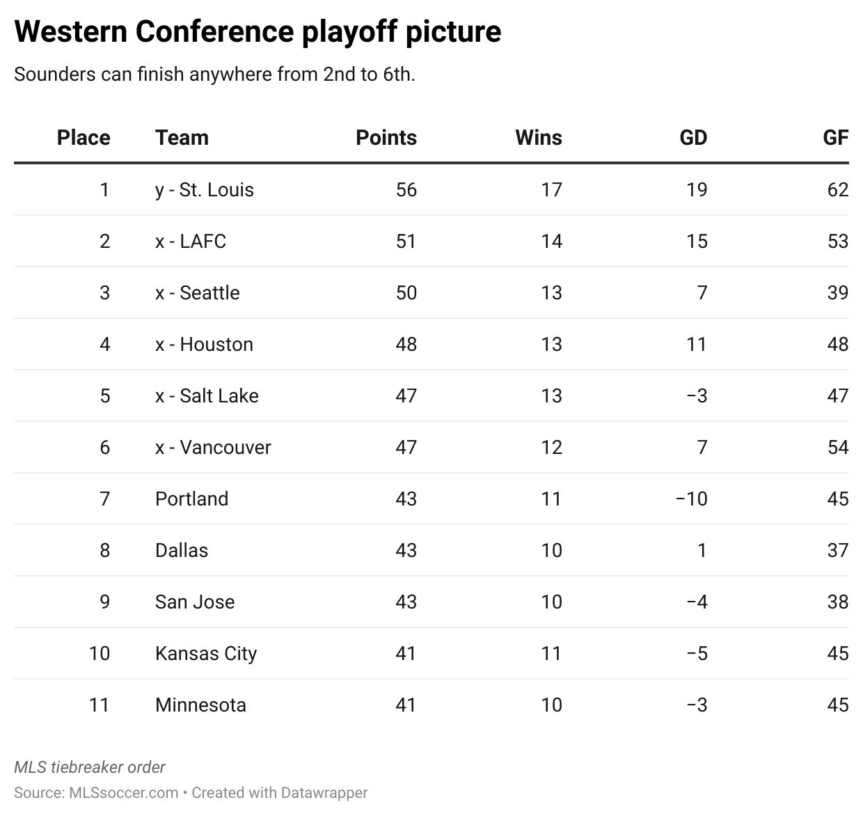 The Sounders can finish anywhere from second to sixth in the Western Conference. As a reminder the order of tiebreakers in MLS goes like this: Total points, wins, goal-difference and goals-scored. They go deeper than that, but there's no scenario where any Western Conference tiebreakers will go deeper. This is what the table looks like with relevant tiebreakers: