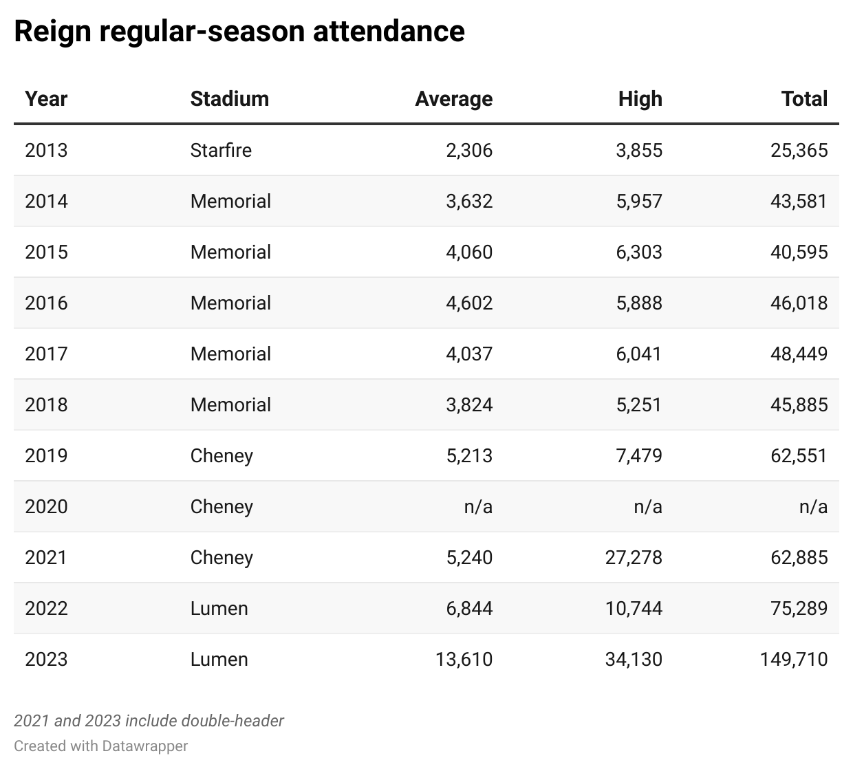 The doubleheader returned in 2023, albeit with more mixed reviews. With the Reign having moved to Lumen Field fulltime in 2022, the novelty had pretty clearly worn off for their fans as more seemed to be annoyed at having to give up their tickets than excited about playing to a bigger-than-normal crowd.