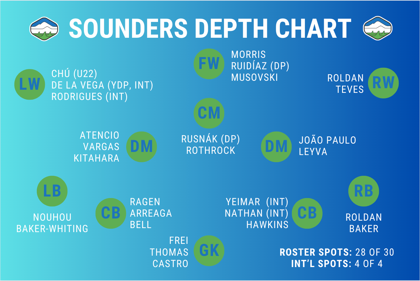 Let’s put the individual results aside and focus on how the Sounders played. We were actually able to watch almost all of the matches and I would say the Sounders looked like a team that intends to press aggressively and hold a good deal of possession. There weren’t stats available from any of the matches, but I’m pretty confident in saying the Sounders had the advantage in shots, possession and turnovers forced in the opposition end in all of them. That didn’t always lead to goals – especially against Odense – but if we’re interested in something like “field tilt”, I'm very confident the Sounders came out ahead consistently.