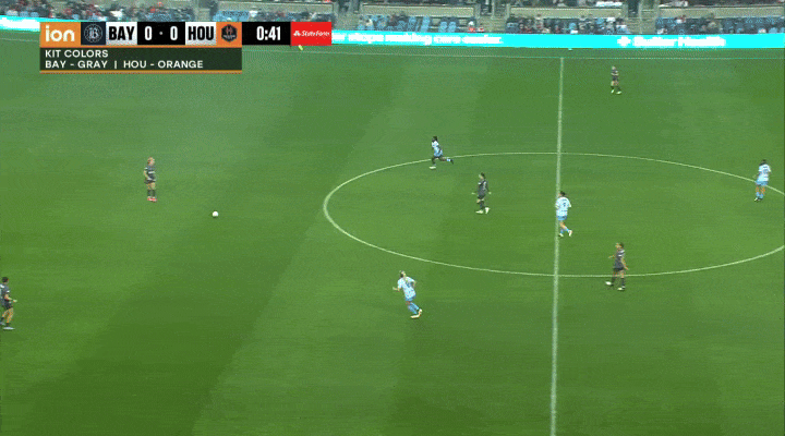 After three matches, Bay FC has forced the second-highest number of high turnovers in the league (47, just one behind the Thorns) and leads the league in tackles won. Bay FC's wing players close down quickly on opponents the second they go wide, with their backline pushing high to try to cut off options up the field.