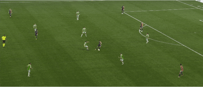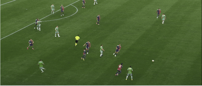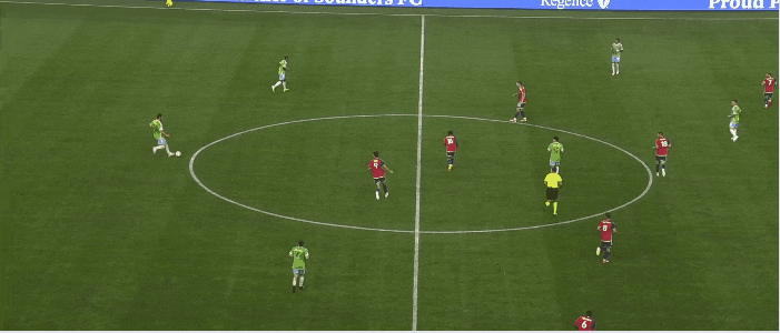 Cristian Roldan continues to make the right back spot his own. Rather than taking up attacking positions on the wing like his brother Alex, Cristian was more apt to join the defensive midfield pair in front of Seattle’s back three. In this sequence, Cristian helps the Sounders get extra attacking numbers centrally: