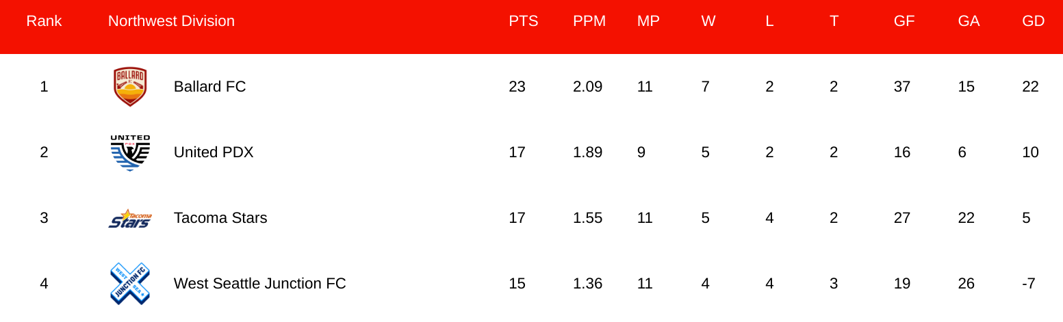 A recent surge by United PDX puts them as the only Oregon team in the top 6 of the Northwest Division. Ballard still rules.
