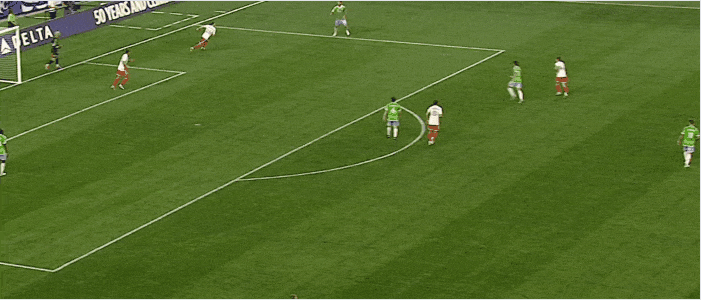Playing Ruidíaz centrally forces Seattle into tight combinations between the defensive lines that are beautiful to watch, but a lot more difficult to pull off: