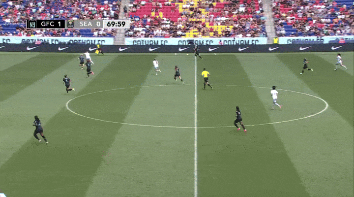If a Gotham player was able to dribble out of pressure on the wing, the Reign tightly marked players in the midfield and picked off passes. Just look how quickly Jess Fishlock pops into frame to mark Delanie Sheehan in this clip.