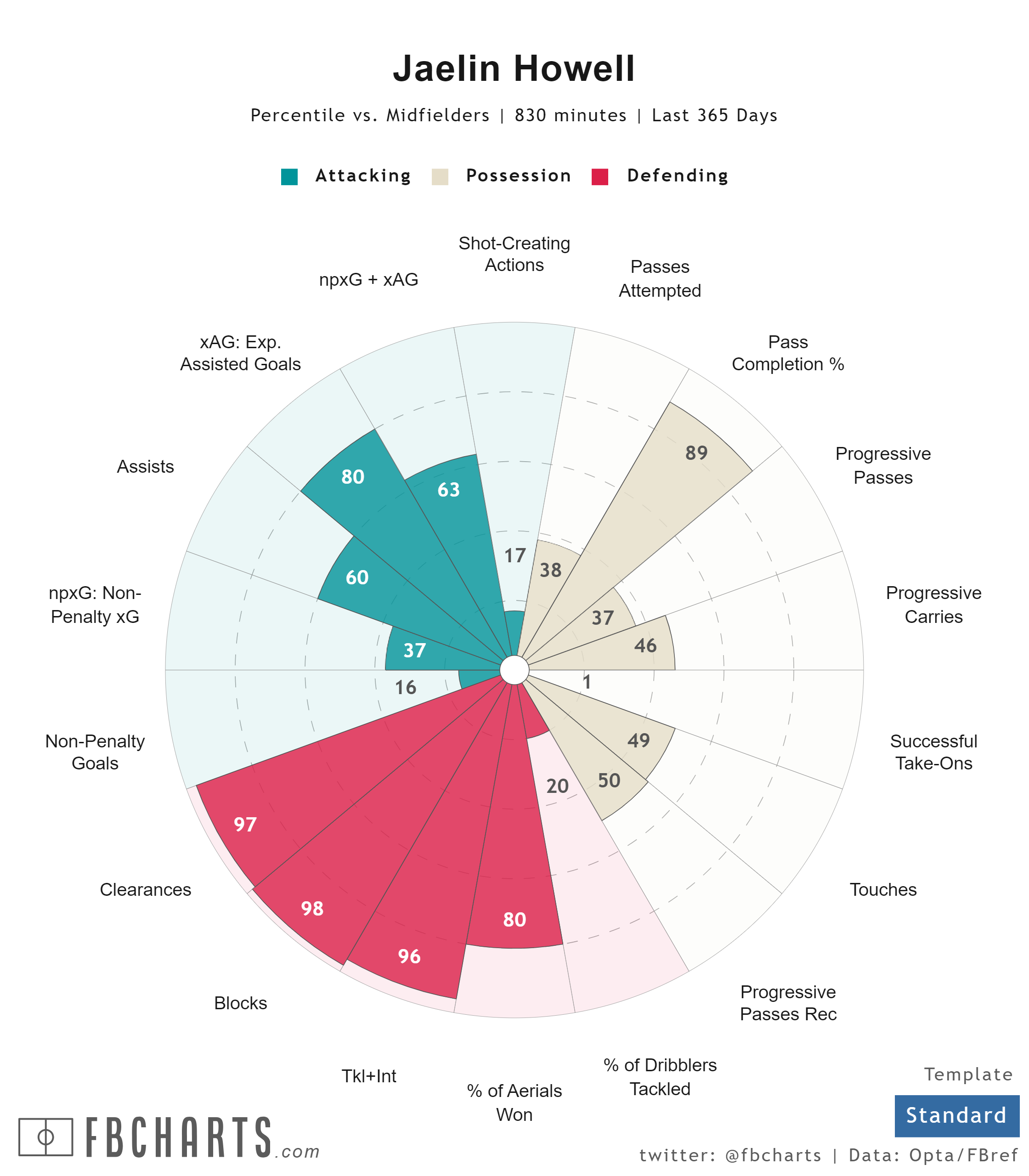Howell is an aggressive ball-winner, most often playing as a defensive midfielder or as a box-to-box midfielder when asked. In 2023, she featured in 21 games and ranked among the NWSL’s best in tackles (6th), tackles won (6th) and duels won (6th). Howell, who missed time in the middle of the season with an injury, was named to the Challenge Cup All-Tournament Team last year as well.