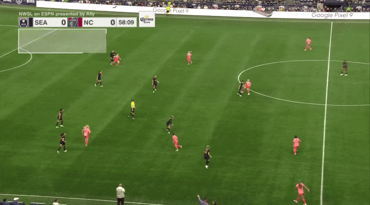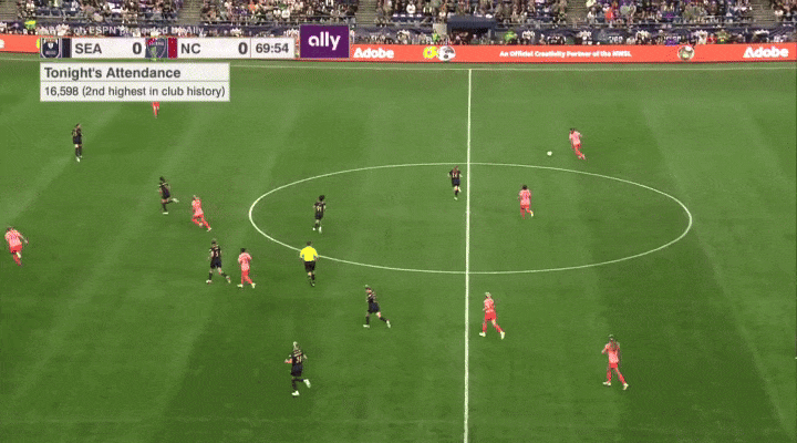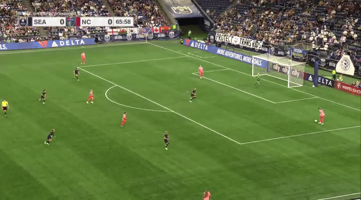 Quinn and Jess Fishlock were also committed to cutting off passes at the top of the 18-yard box, where Ashley Sanchez likes to operate. Look at them both sprint instantly toward that spot as North Carolina got the ball to their wide attacker.