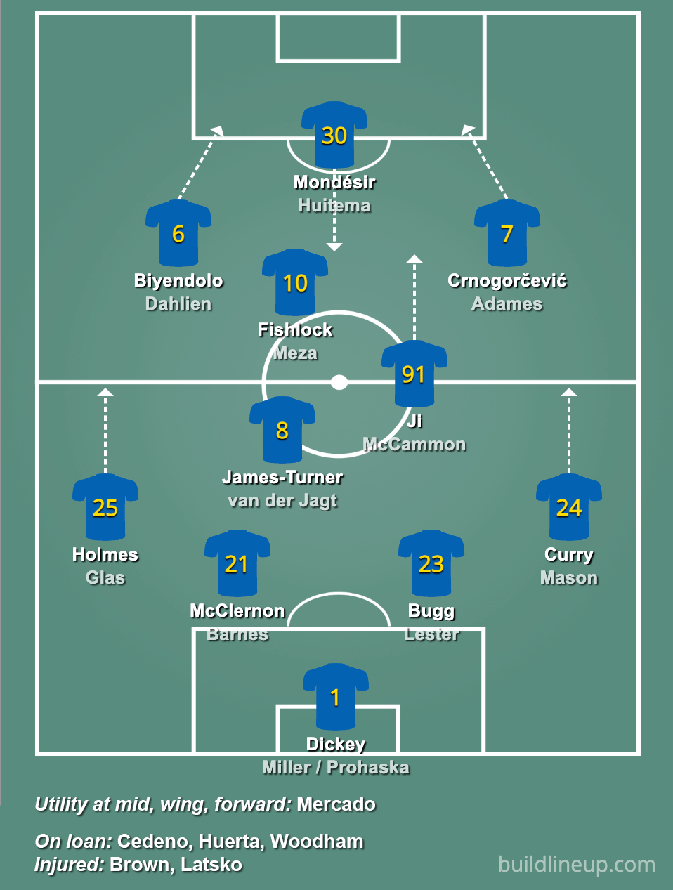 Angharad James-Turner seems poised to start the year in the defensive mid role. Ji So-yun primarily played as an attacking mid last year but showed some real promise in a deeper role late in the season, and that shift has carried over in preseason this year, where her vision and passing ability can potentially shine on progressive balls to streaking forwards. Jess Fishlock, who will only stop playing soccer after her legs fall off and even then might still figure out a way to effectively slide tackle opponents with her torso, has been getting starting minutes as the other midfielder, generally playing a bit higher up the pitch than Ji. But as noted above, expect to see a lot of rotation between the three midfielders and even the central forward dropping into the midfield.