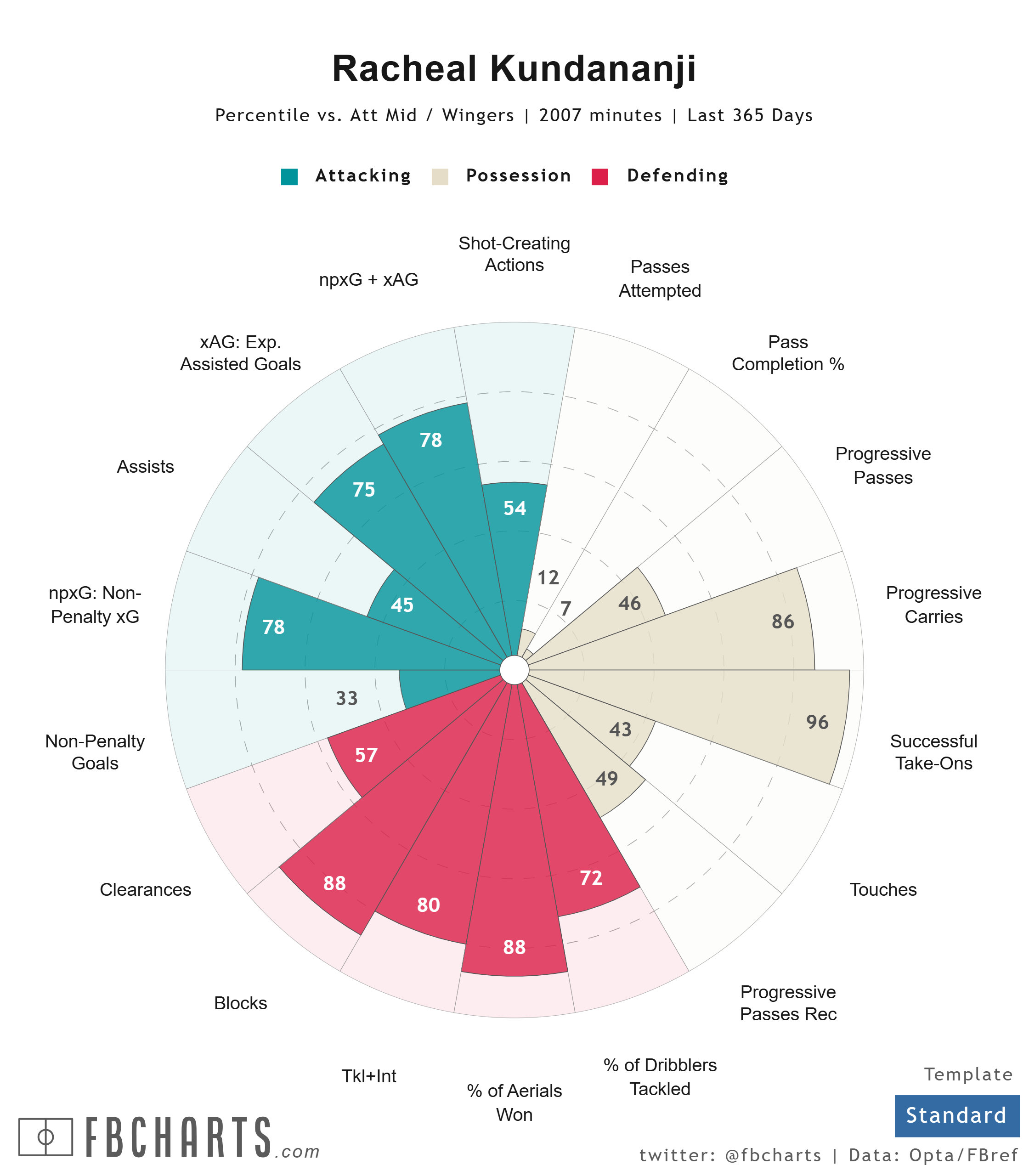 Racheal Kundananji: The Zambian forward has struggled to get on the scoresheet this year, but she's still a big threat for Bay FC when on the field. Kundananji, who usually starts on the wing, is speedy and crafty on the ball and loves to pressure opposing backlines. As you can see from the chart below, she is above the average winger in carries, successful take-ons, non-penalty expected goals, and several defensive categories.