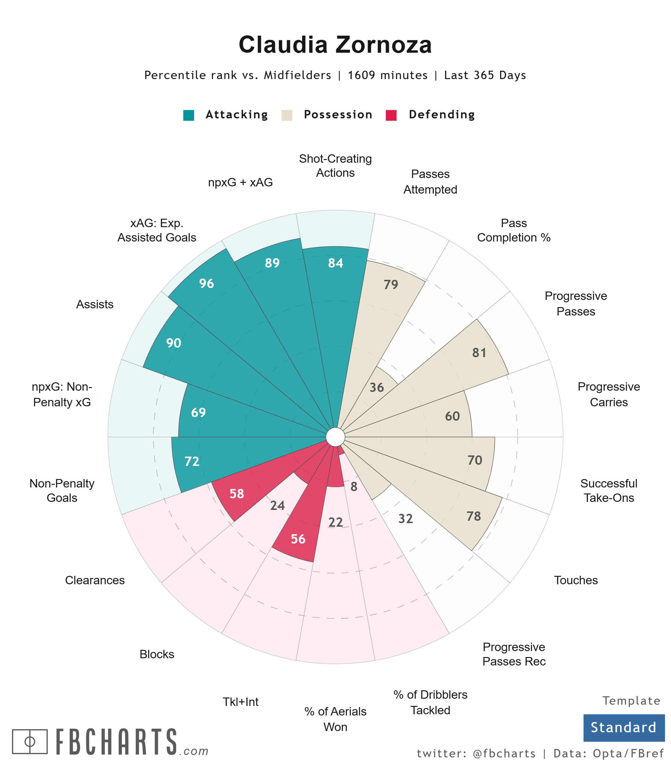 Claudia Zornoza: The Spanish midfielder joined Utah in the middle of the 2024 season and made an immediate impact. Zornoza is a skilled distributor who helped Spain win the 2023 World Cup, appearing in two of the group stage matches. She doesn't require many touches to make an impact. Zornoza is in the 80+ percentile among midfielders for progressive passes, shot-creating actions, and assists. She has a goal and an assist this year. The Reign will want to limit the amount of time she has on the ball and cut off her options further up the field.