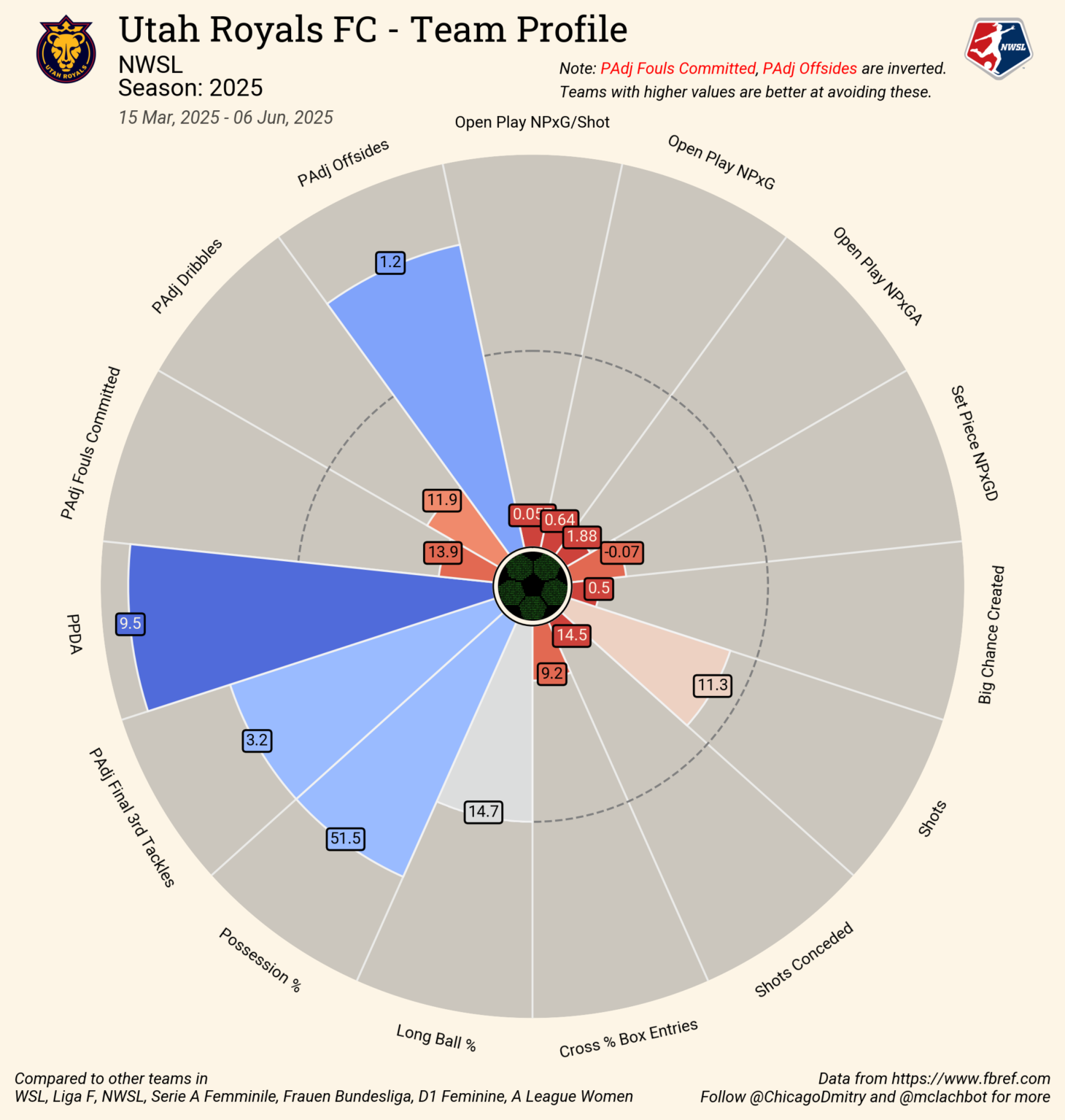 Utah's press: While Utah might not be a team that high presses other teams, they do like to close down quickly on opponents. That is evident in two key stats. Utah leads the league in fouls per match (13.5). And their PPDA (passes per defensive action) is 9.5. That means Utah allows 9.5 passes for every defensive action they take—interception, tackle, foul, etc. The lower the number, the more a team likes to pressure their opponents. The Reign's PPDA is 11.9. Expect Utah to try to disrupt the Reign frequently as they attempt to build possession.
