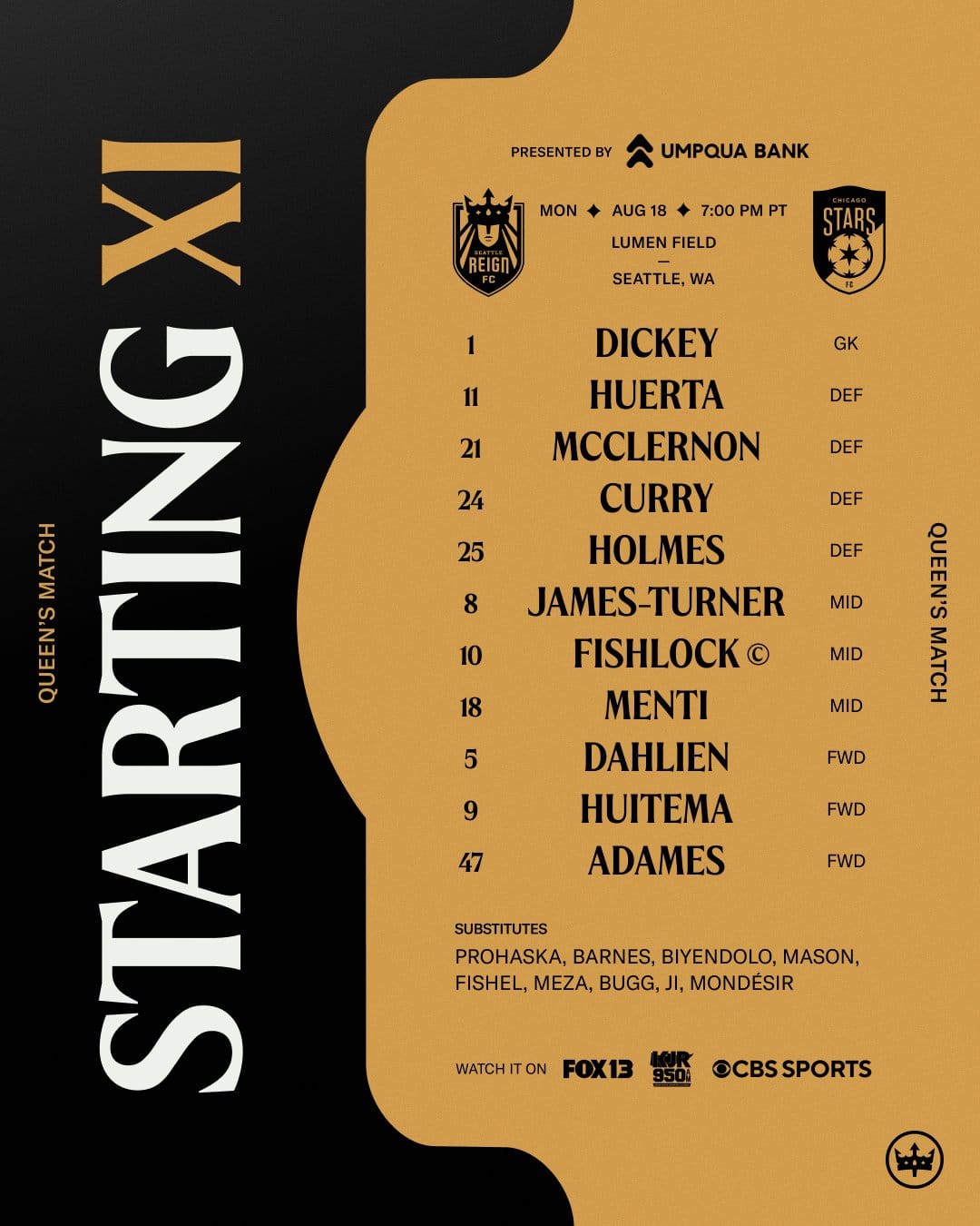Broadcast: CBS Sports Network (Lisa Carlin & Lori Lindsey), Fox 13+ (Seattle; Steve Schlanger, Laura Schott & Kelyn Rowe); NWSL+ (international)