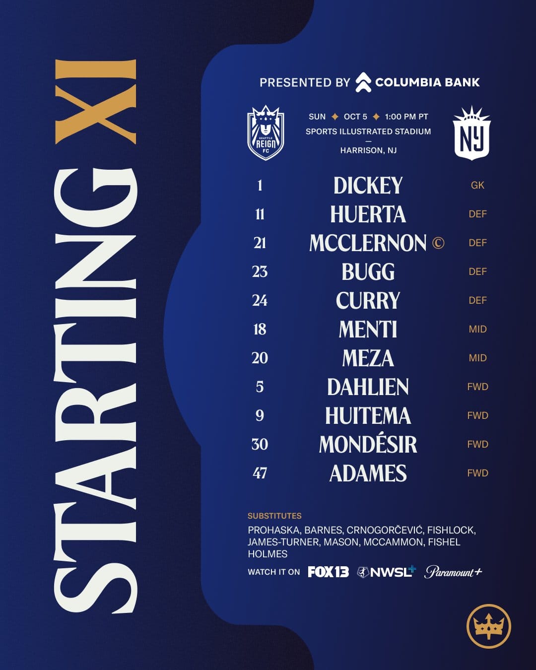 Broadcast: Fox 13+ (Seattle; Steve Schalnger & Kelyn Rowe) / NWSL+ (Mike Watts & McCall Zerboni)