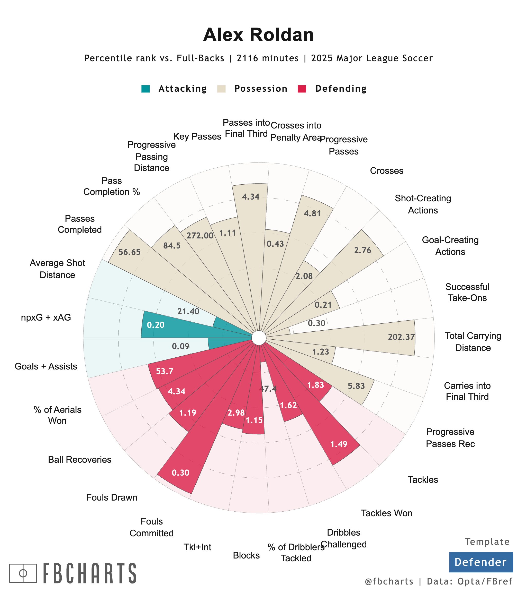 Perhaps no player emerged as more crucial to how the Seattle Sounders wanted to play this season than Alex Roldan. Not only is he one of the best fullbacks in Major League Soccer, he makes the team’s ball-dominant possession style function, and he’s increasingly taken on a leadership role within the team. In 2025 he even stepped up with one goal and nine assists across all competitions, with his lone goal coming from the penalty spot against Inter Miami in the Leagues Cup final. Despite all that, he’s still not exactly an obvious star, as his contributions tend to fly under the radar of most observers. As Jamie Carragher somewhat famously once said, “no one wants to grow up and be a Gary Neville.”
