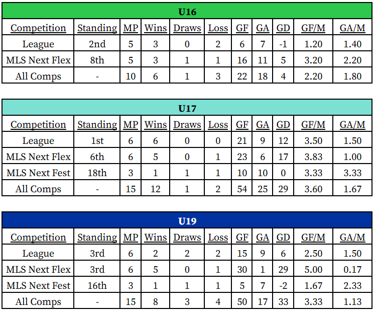 One notable takeaway from the results was the U17 team continued showing their offensive prowess with 10 goals scored over the 3 games they played. Through all competitions that has them sitting at 3.6 goals scored per match over 15 total matches played.