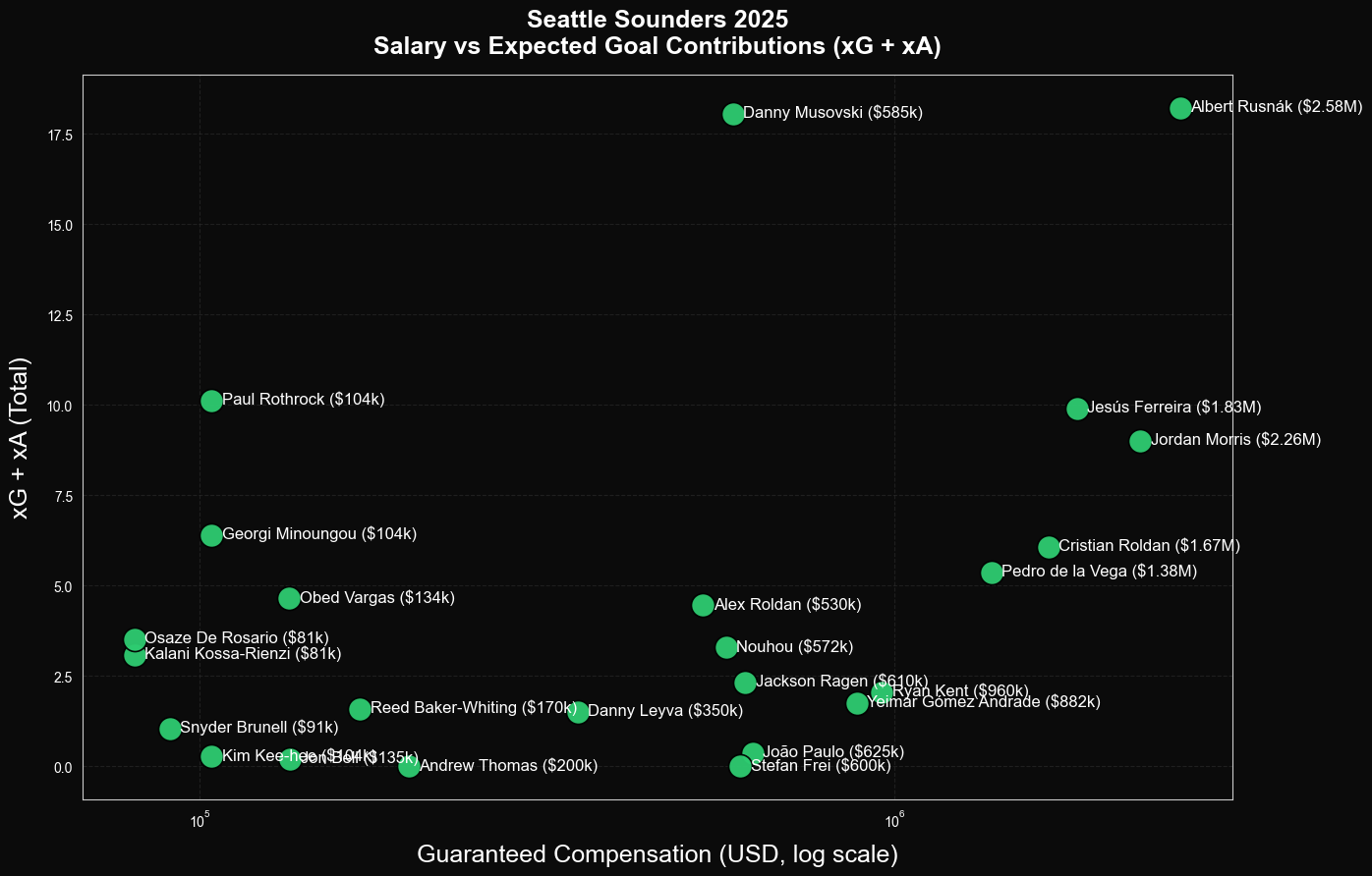 Everyone agrees that Rothrock’s raw production in 2025 far outpaced what his salary would normally buy in MLS. On a guaranteed compensation of $104k, Rothrock finished the season with 10 combined goals and assists in league play. This was a level of output surpassed only by Albert Rusnák and Danny Musovski among all Sounders players.