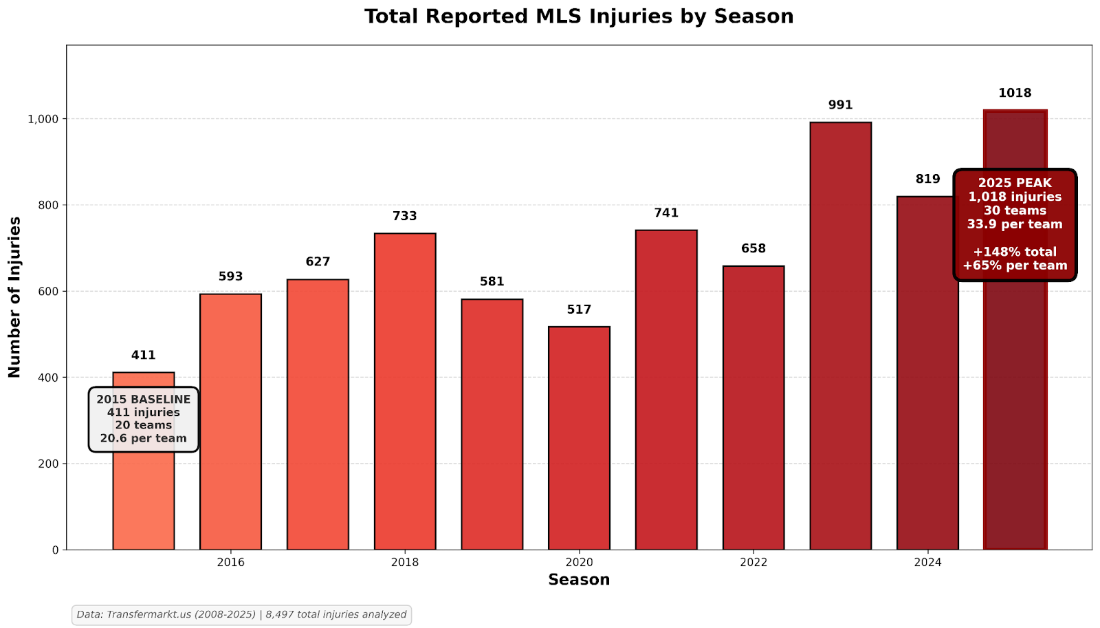 Before diving into surface effects, it's worth understanding how much the baseline has shifted. MLS injuries have increased substantially over the past decade. The league recorded 411 player injuries in 2015; by 2025, that number reached 1,018. Even accounting for expansion from 20 to 30 teams, injuries per team rose from 20.6 to 33.9 — a 65% increase. Based on current trends, teams should expect approximately 30-35 injuries per season in 2026.