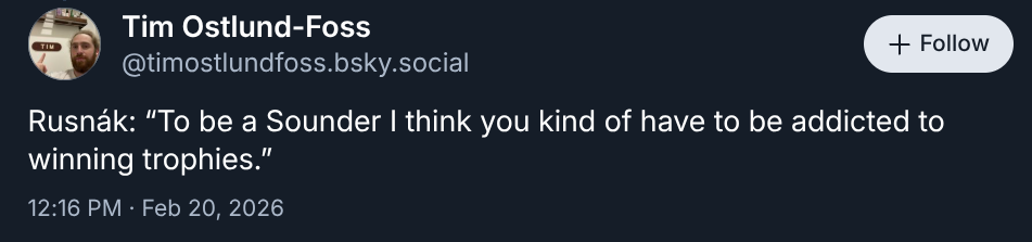Which is true when you think about the fans of other teams, and maybe even a vocal minority of Seattle Sounders fans. There's a pervasive defeatism in some, who forget that Seattle wins trophies, lots of them – even in their worst seasons they win international trophies.