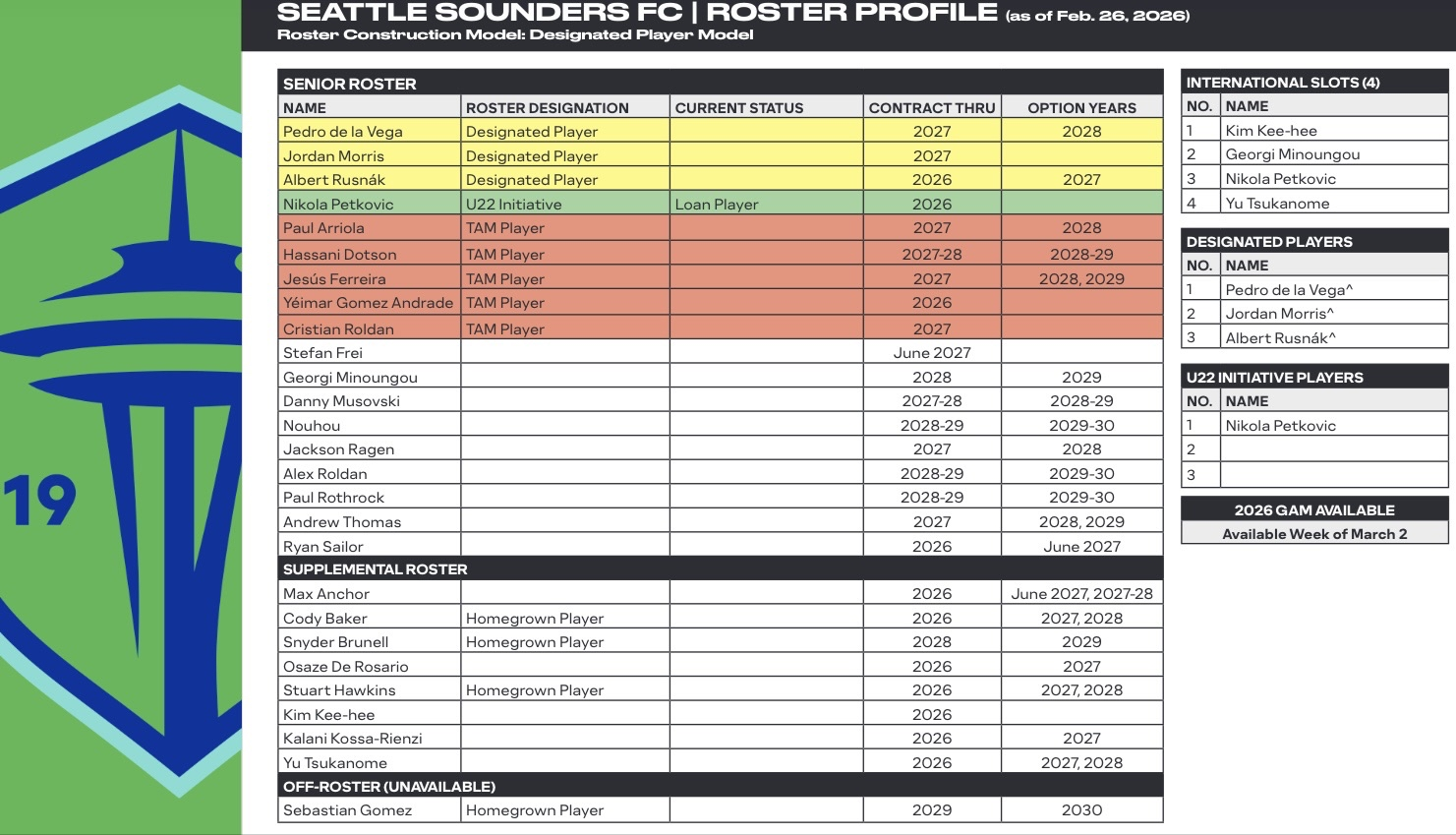 Over the last few years, MLS has started to become a bit more transparent with how rosters are constructed. One of the most useful pieces of data is the “Club Roster Profiles” which are updated at least twice a year. The first update of 2026 was released on Friday and actually broke a bit of news for the Seattle Sounders.