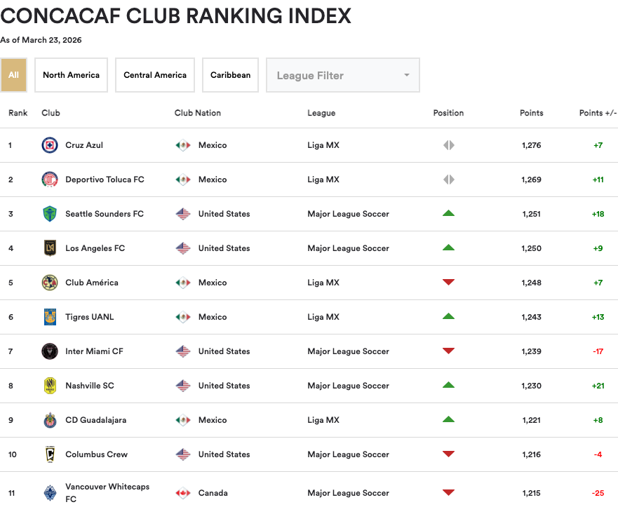 Fresh off beating the Vancouver Whitecaps in Concacaf Champions Cup play, the Seattle Sounders have moved all the way up to No. 3 in the region’s club ranking system. This appears to be the highest the Sounders have ever reached in that index.