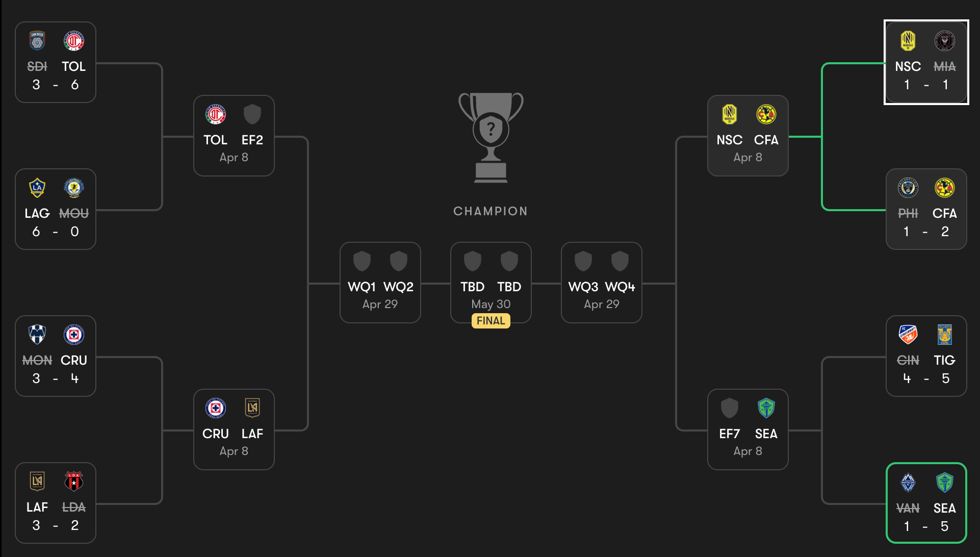 From the quarterfinals forward, hosting the second leg is determined by cumulative points from the Round of 16 forward. The Sounders and LA Galaxy are the only two teams with six points and are on opposite sides of the bracket. The Galaxy will play Toluca in the quarterfinals. The Sounders-Tigres winner will face the winner of Nashville-America in the semifinals. Nashville claimed two points in the Round of 16, while America had four.