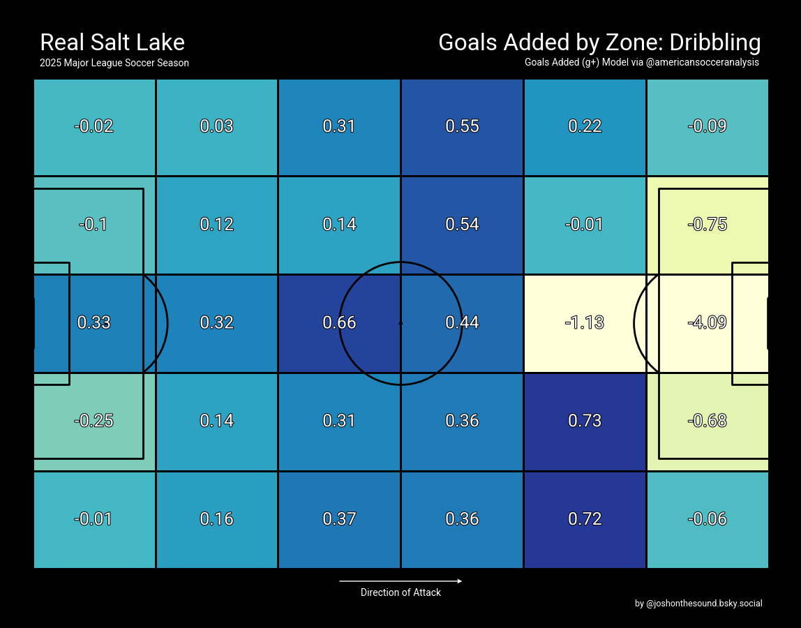 The home team's strong "Central Attacking" tendency as measured by futi is very apparent when plotting American Soccer Analysis' "Goals Added" model (aka "g+") onto a field map. g+ measures "a player’s total on-ball contribution in attack and defense" and breaking out where these high-value actions occurred on a field heatmap does a good job of illustrating this team's areas of attacking emphasis.