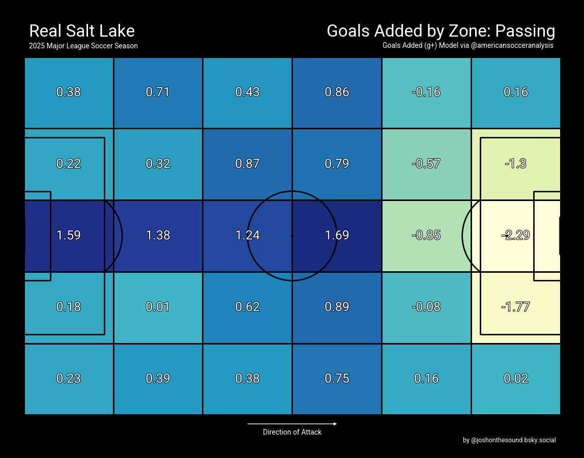 American Soccer Analysis' "Average Vertical Passing Distance" measure gives us a sense of just how direct Salt Lake's approach was in this game: their average 7.51 yards of vertical distance eclipsed all but two of their games in 2025. For comparison, the most direct team in MLS, the Philadelphia Union, had a 7.65 yards of average vertical passing distance last year. Even by their own prior standard, RSL was pushing the envelope in this game. They were absolutely going for it.