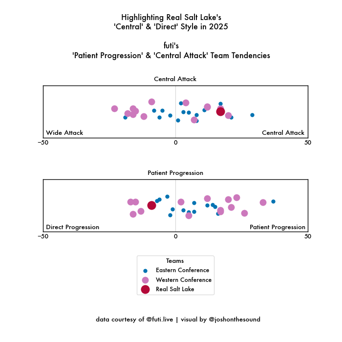 Per Futi's Team Tendency model, among Major League Soccer teams in 2025 Real Salt Lake had one of the strongest "Direct Progression" tendencies in not just the West but the entirety of the league. Last month, I talked about how MLS has been drifting away from direct progression through midfield these last few seasons. Pablo Mastroeni has incidentally been one of the few to resist this pull toward patience. And that's exactly how it played out Saturday. New season, same Pablo.