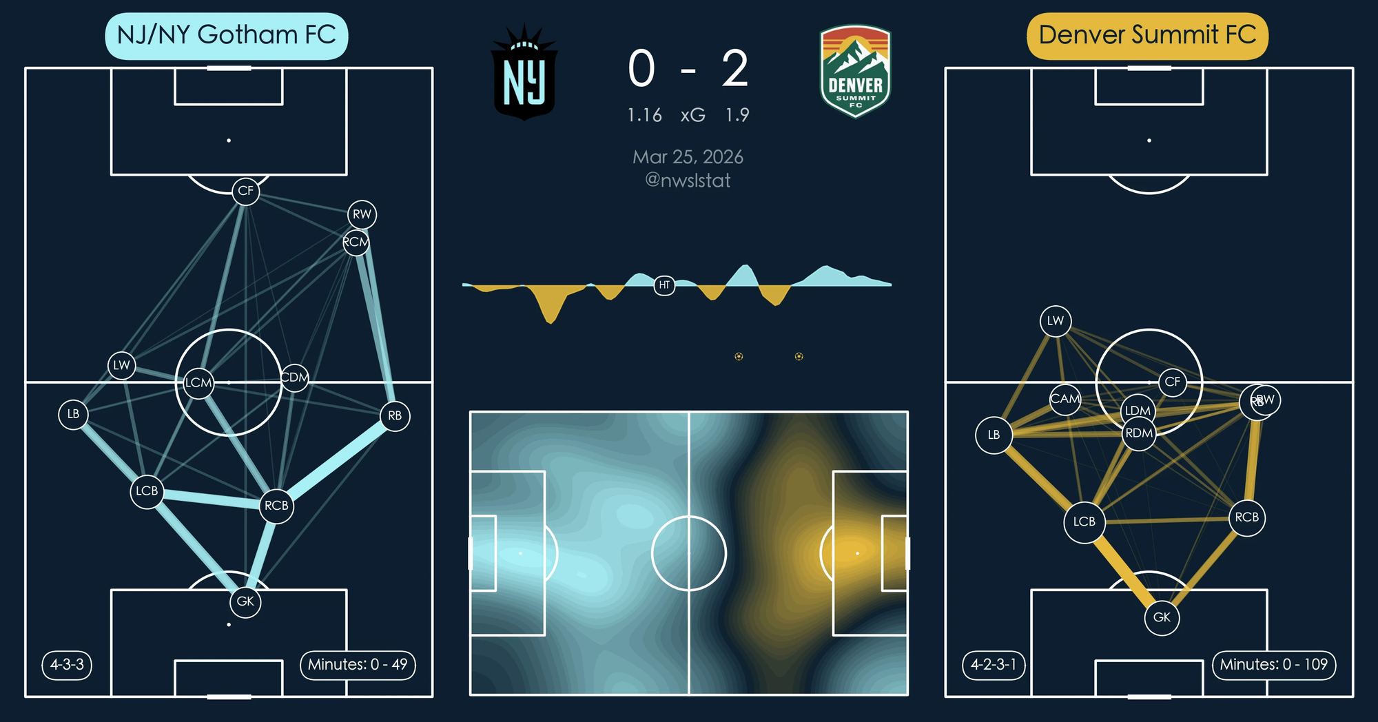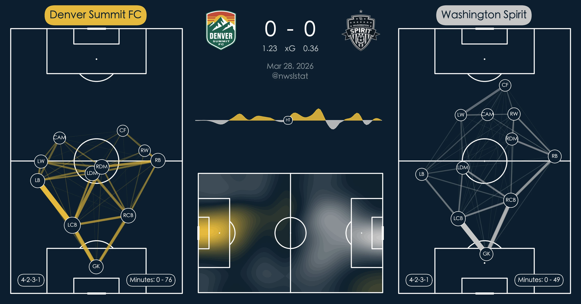 As these four charts from Catalina Bush (@NWSLStat on Bluesky) show, Denver is very comfortable sitting back defensively and building from the back. On a smaller field like ONE Spokane Stadium, this could clog up the Reign's passing channels. That's something the Reign struggled with against Portland when the Thorns went down a player. The Reign will need to create overloads and find the pockets against a team that defends like this.
