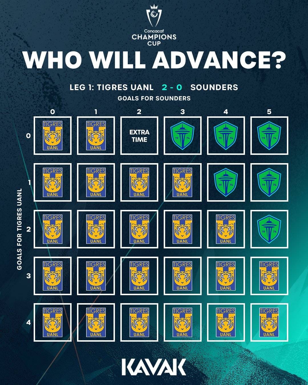 Should the Sounders win 2-0, the match will go to extra time and a shootout if necessary. If Tigres score a goal, the Sounders will need to win by at least three goals to avoid being eliminated from the tournament.